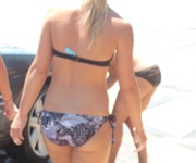 Petite brunette aux gros seins à la plage